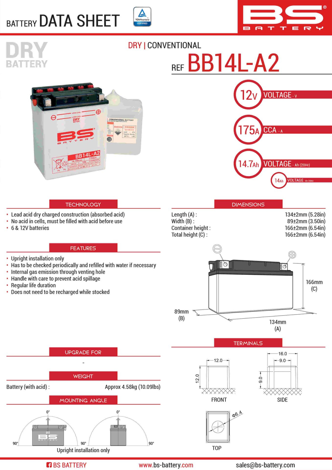 BS BATTERY - acumulator BB14L-A2 (YB14L-A2), 12V, 14Ah, 175A, 135x91x167 mm, cu intretinere,