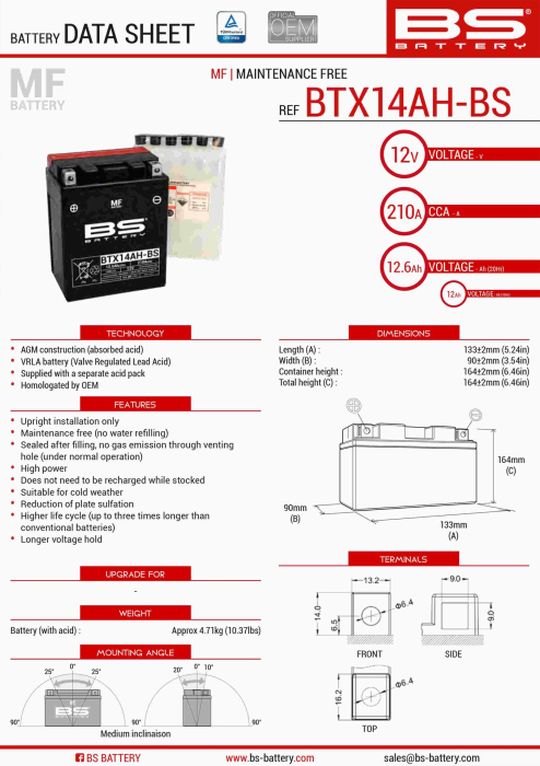 BS BATTERY - acumulator BTX14AH-BS (YTX14AH-BS), 12V, 14Ah, 210A, 134x89x166 mm, fara intretinere,
